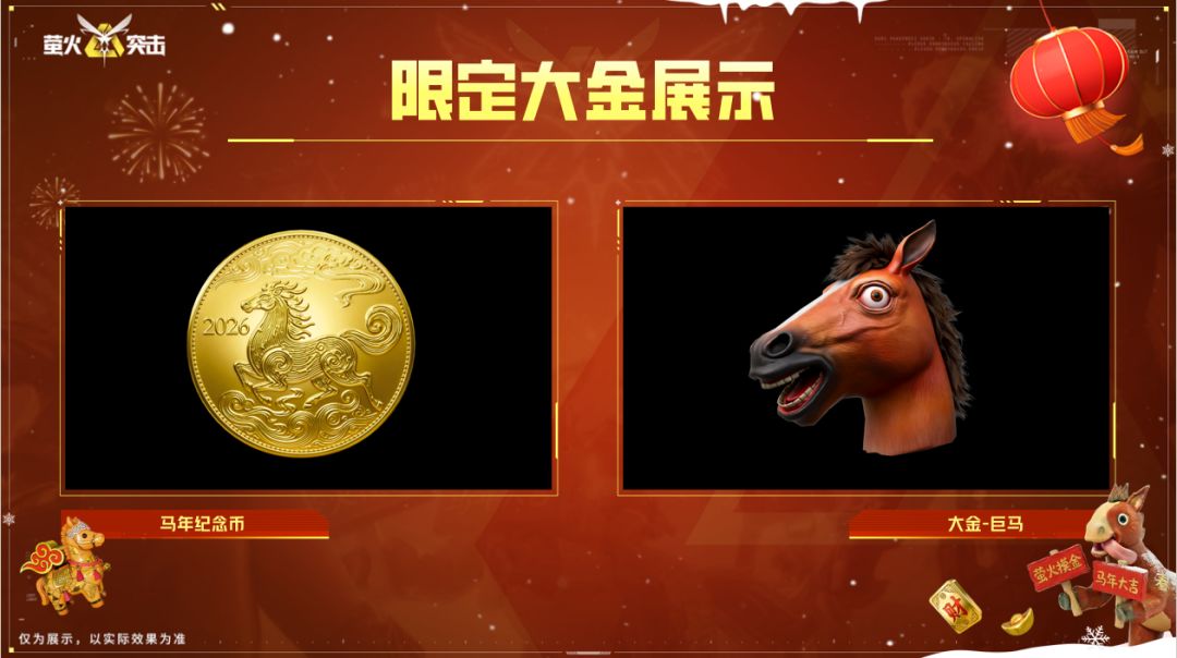 马年新年局,当然要搜限定大金!马上有五福大金登场,幸福小马出击;马年纪念币正式上线,希望奔马祥云的纹理能给萤火虫们带来马到成功的祝愿;收集新大金-巨马,还能限时体验新时装,穿上变身 “马头人”,祝萤火虫们新年摸金抱满大金,马到功成好运稳!