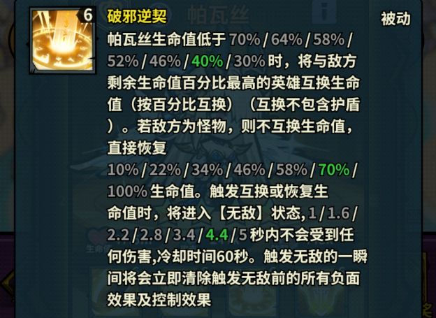 帕瓦丝生命值低于30%时,将与敌方剩余生命值百分比最高的英雄互换生命,pve则完全恢复自身血量,触发互换或恢复生命值时,将进入【无敌】状态,