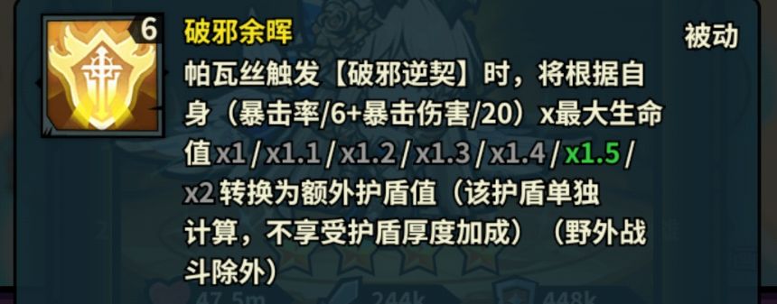 帕瓦丝触发【破邪逆契]时,将根据自身 (暴击率/6+暴击伤害/20) x最大生命值转换为额外护盾