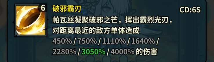 帕瓦丝凝聚破邪之芒,挥出霸烈光刃,对距离最近的敌方单体造成伤害