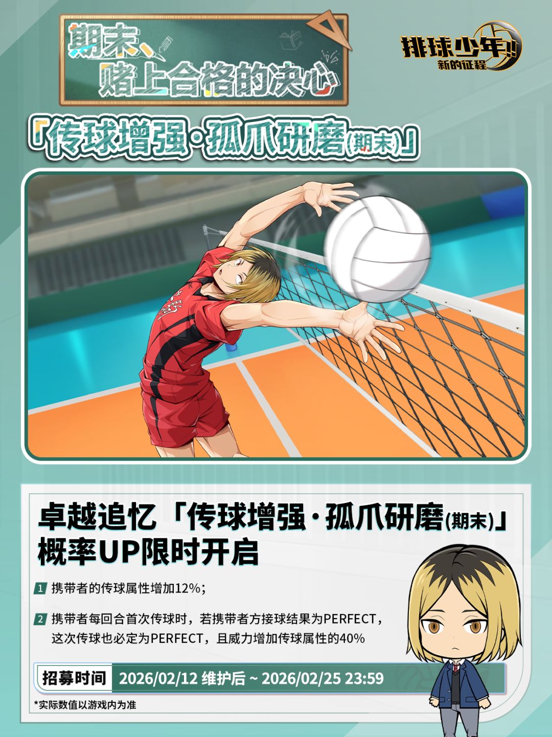 🏐卓越追忆招募限时开启:「传球增强・孤爪研磨(期末)」。