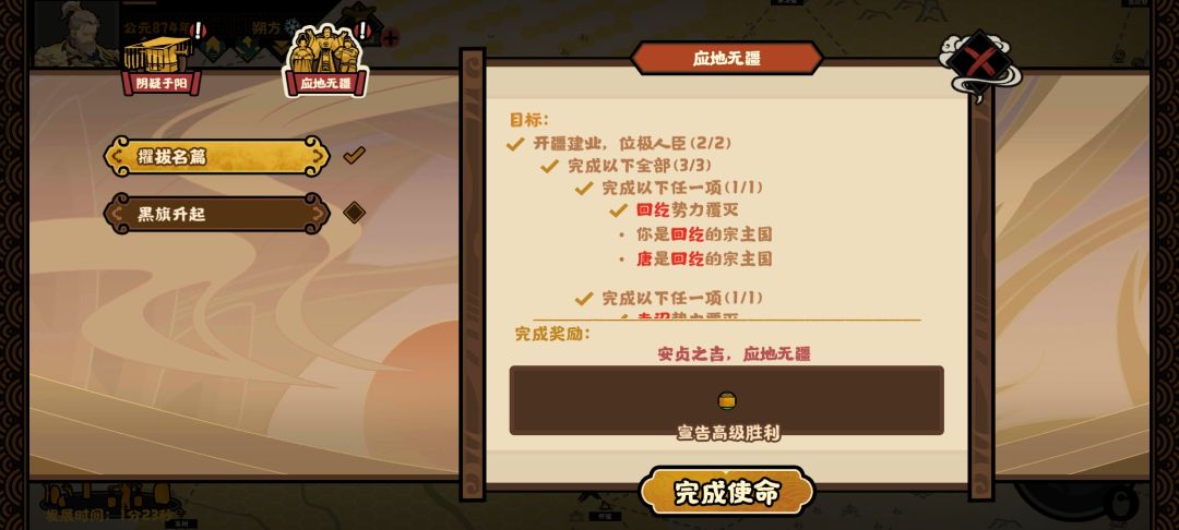 简单来说就是把渤海、南诏、回纥、吐蕃全灭掉。你不是国家集团首领,把他们变成附庸很难。然后就完成应地无疆