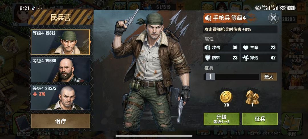 在民兵营里花费金币即可将招募的难民转化为士兵。在勘探过程中受伤的士兵需要在民兵营花费金币进行治疗。士兵升级需要民兵勋章,民兵勋章的获取渠道有两个,一个是每日5次的灾厄医院,一个是每周1次的灾厄巨兽结算奖励,关于这两个玩法我后面再细说。