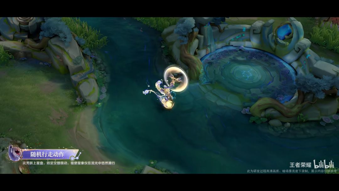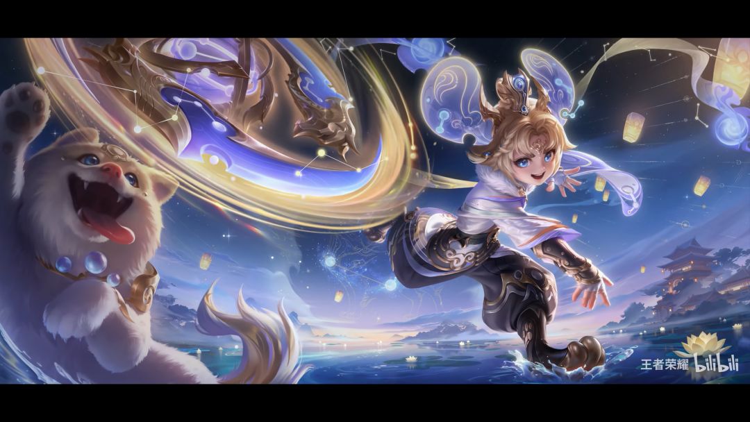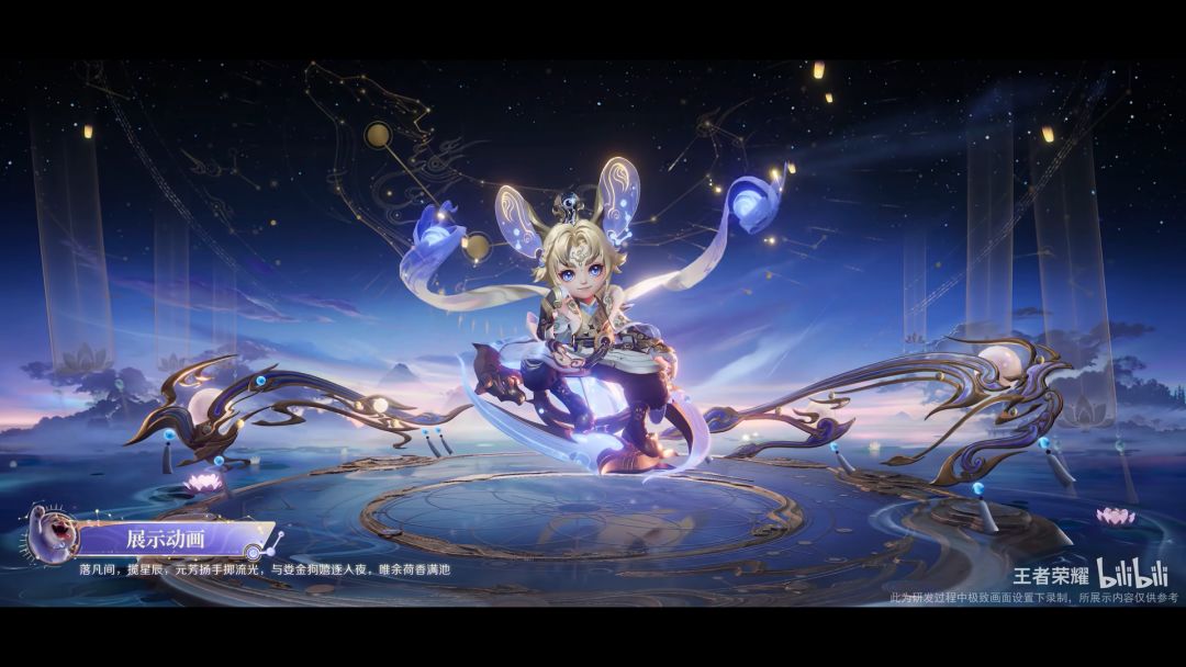 特效设计整体以国风神话中的娄金星君为灵感,融入星宿以及星象仪等元素,采用蓝金色为主色调,并以代表星辰神力的紫色点缀其间,体现李元芳活泼机灵,充满少年心气的人物特点。