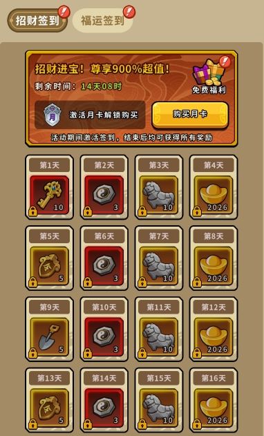 - 活动内容:活动期间主公在商城-签到界面开通招财签到,并通过登录游戏领取对应签到天数的奖励;