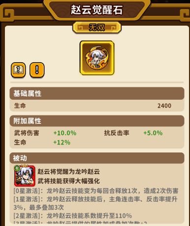 4 觉醒方法:主公可在武将界面中选择武将赵云,在赵云详情界面中点击觉醒按钮,使用1颗赵云觉醒石将武将赵云觉醒