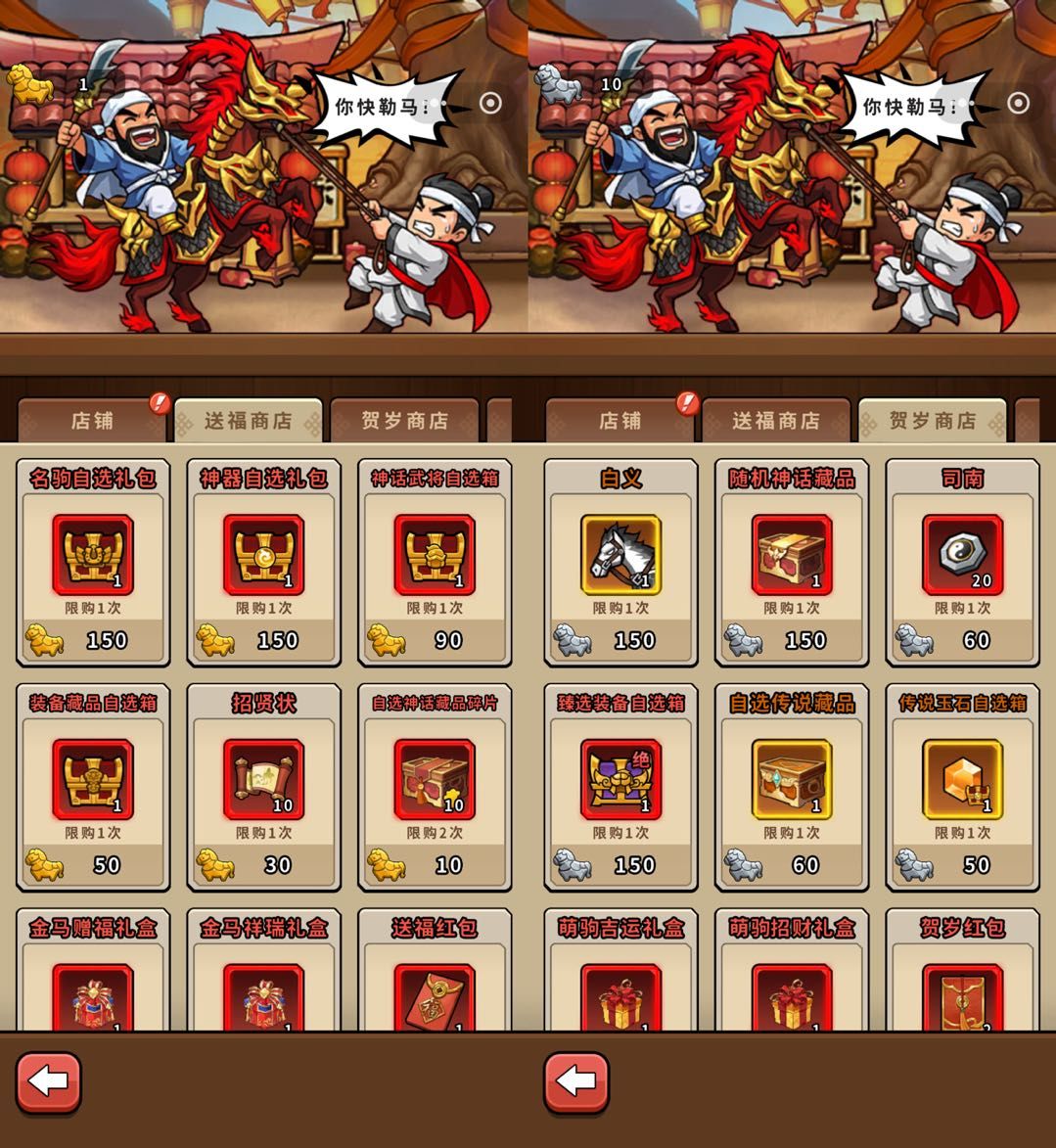 - 活动内容:活动期间主公在超值界面购买礼包可获赠礼包界面显示数量的送福金马或贺岁萌驹;