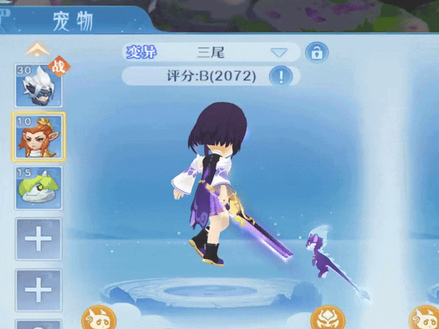 幼年时身着浅紫短裙,龙角初显。进阶后身着深紫长袍,龙角修长,双腿覆有紫金丝缕,王者气质尽显。