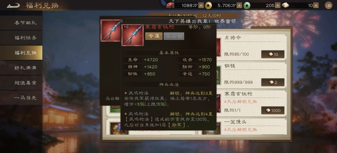 先换策马迎新春,再换自选好礼换绿石头,然后点将令,馒头,铜钱,枪。
