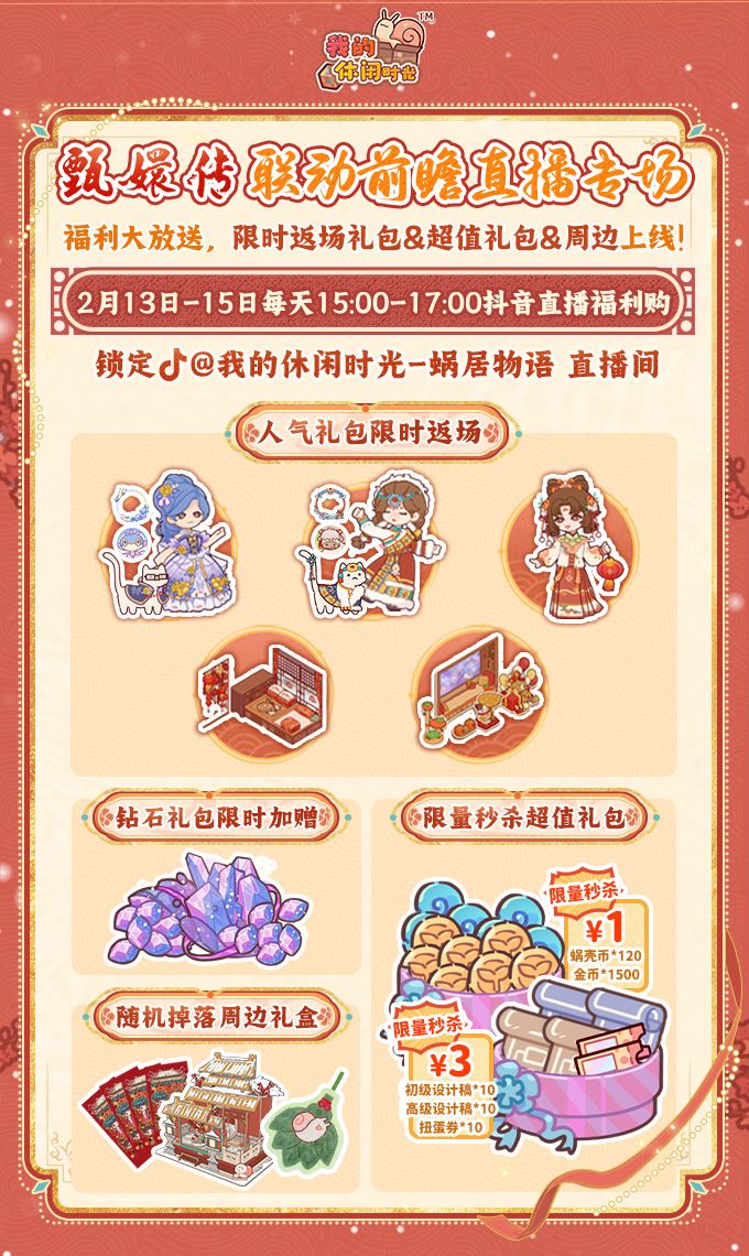 📢马上就是新年了,是时候该准备囤年货啦!2月13日-2月15日每日下午15:00,锁定🎵抖音@我的休闲时光-蜗居物语,超多惊喜礼包等你来解锁~