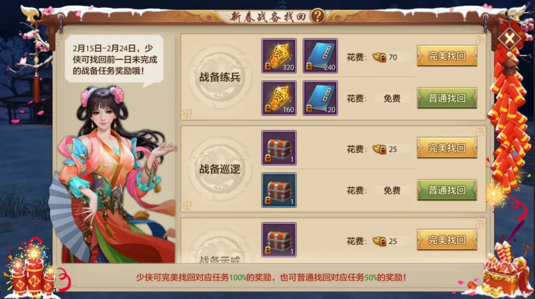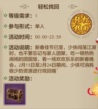 另外,轻松找回功能也暖心回归啦~出门走亲访友、赏景欢聚,难免错过游戏日常?别担心!2月15日至2月24日,少侠只需消耗1铜钱或1玉虚葫,就能轻松找回前一天未完成的活动奖励,再也不用怕错失福利,安心过年、快乐江湖两不误!