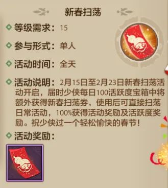 等级大于等于15级的少侠,只要每日攒够100活跃度,就能额外领取新春扫荡券,用券直接扫荡日常,省去手动肝任务的时间,100%拿满活动奖励和活跃度,祝少侠新春喜乐,马到成功,轻松玩转江湖!