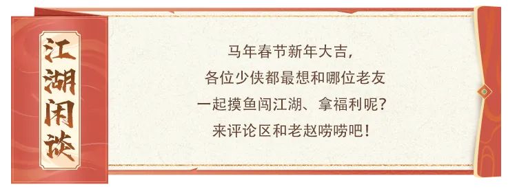 少侠们,放下内卷,告别内耗,赶紧码住活动时间,一起轻松玩游戏、快乐过春节,愿大家马年大吉,喜乐常伴,江湖顺遂,团圆与福利兼得,新春过得舒心又自在!