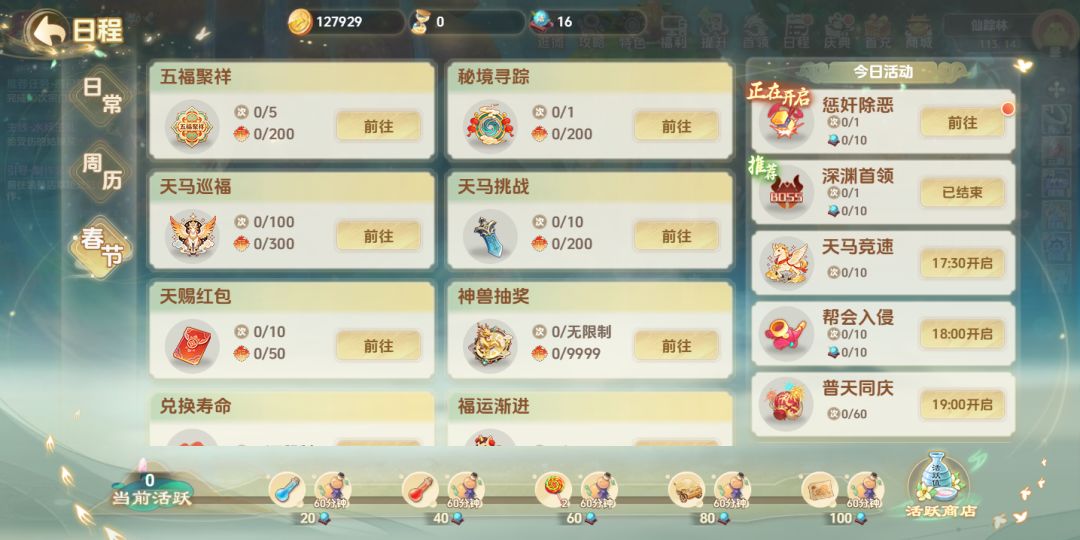 即日起,凡是在【日程—春节】处参与了任一新春专属活动:【五福聚详、秘境寻踪、天马巡福、天马挑战、天赐红包、神兽抽奖、兑换寿命、福运渐进、天马竞速、共御年兽、天马贺岁、元宵祈愿】均可参与抽奖!