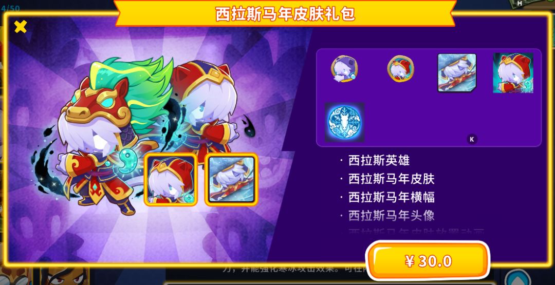 您可以用猴币解锁西拉斯及马年皮肤,也可以直接购买礼包,礼包内含:西拉斯英雄,西拉斯马年皮肤、西拉斯马年横幅、头像,以及专属放置特效。