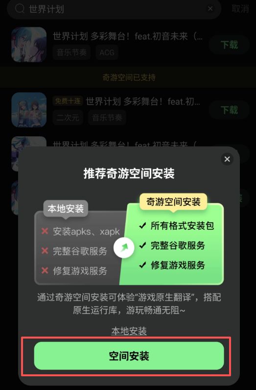 第四步:选择空间安装(日服一定要选择空间安装,可以一键汉化哦!)
