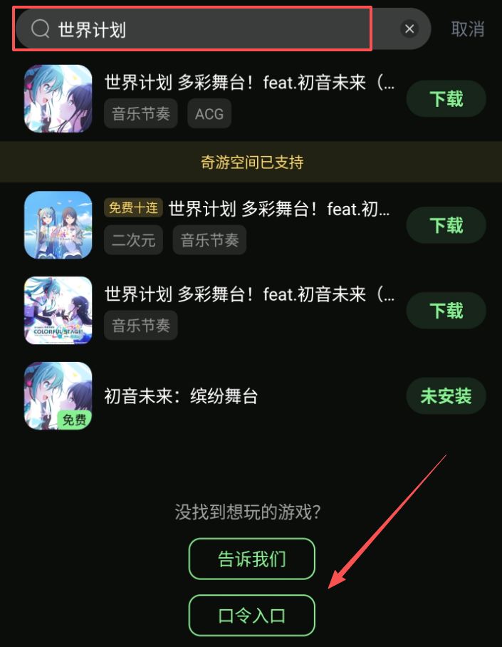 第二步:搜索世界计划,先点击下方口令入口,输入“初音未来”解锁权限,领取加速时长