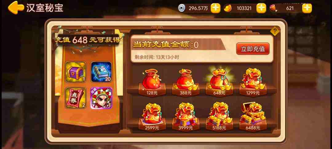 单笔充值648元:元宝*6480,祈天律令*300