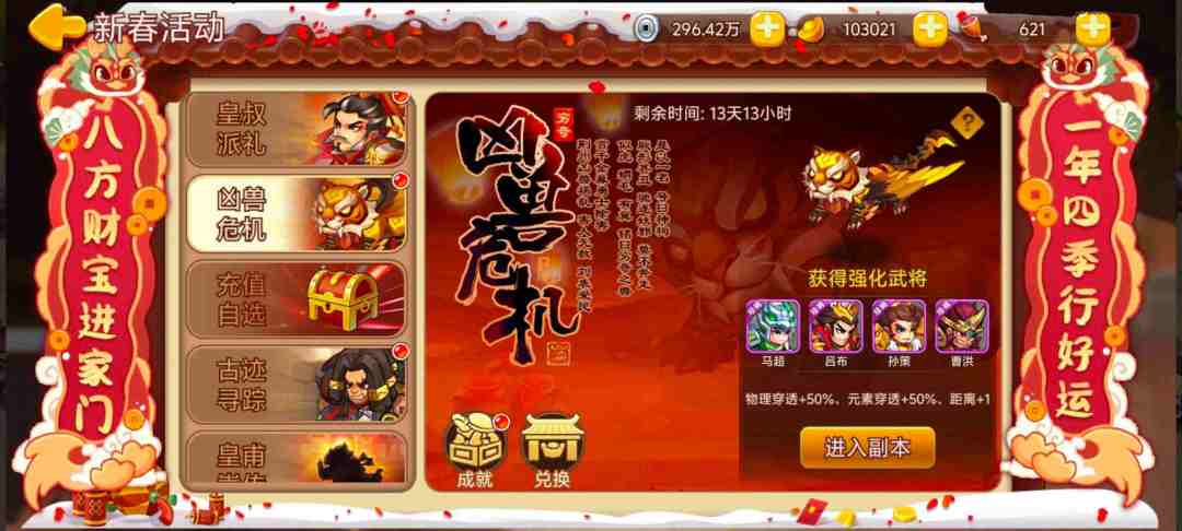 活动内容:活动期间开放凶兽危机副本,每轮挑战中将遇到随机事件,挑战结束时将会根据本轮表现结算年画(每日上限1000),年画可兑换奖励。
