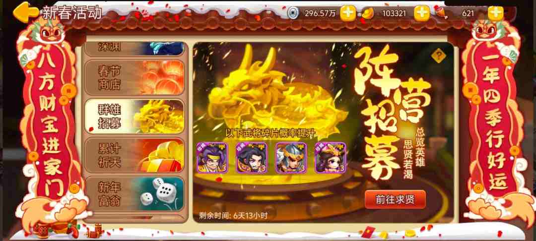 活动内容:活动期间开启群雄武将阵营招募,张宝、陈宫、华雄、貂蝉武将求贤获得概率提升。
