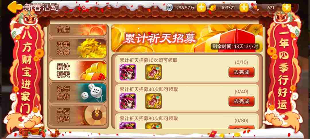 活动内容:活动期间累积祈天达到次数,即可领取神将碎片等奖励。