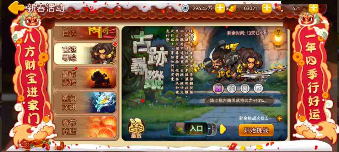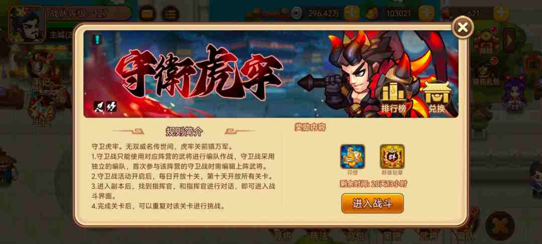 活动内容:活动期间开启群雄守卫战,挑战关卡获得印绶和勋章兑换稀有奖励。