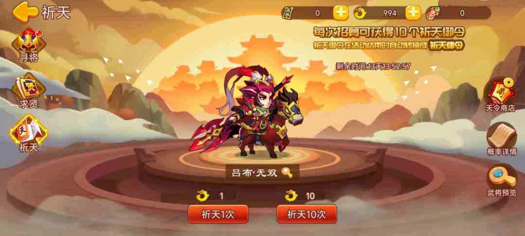 累计祈天10次:祁天御令*20,吕布·无双碎片*1
