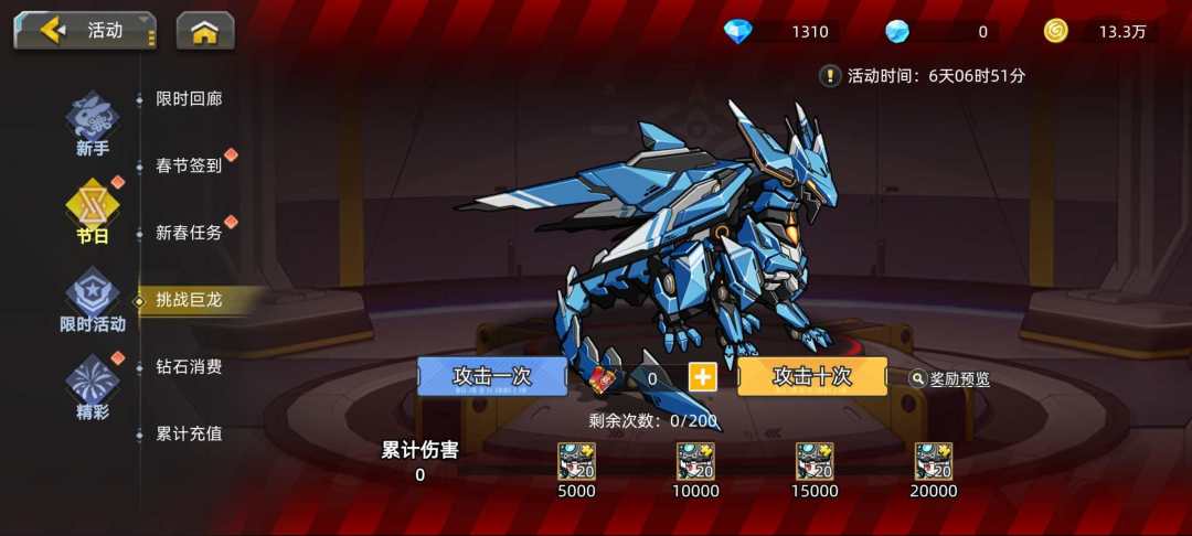 活动内容:活动期间,消耗节日道具“鞭炮”即可攻击巨龙并造成伤害,每次攻击巨龙都会随机掉落道具,对巨龙累计造成的伤害达到目标值,即可获得额外奖励!
