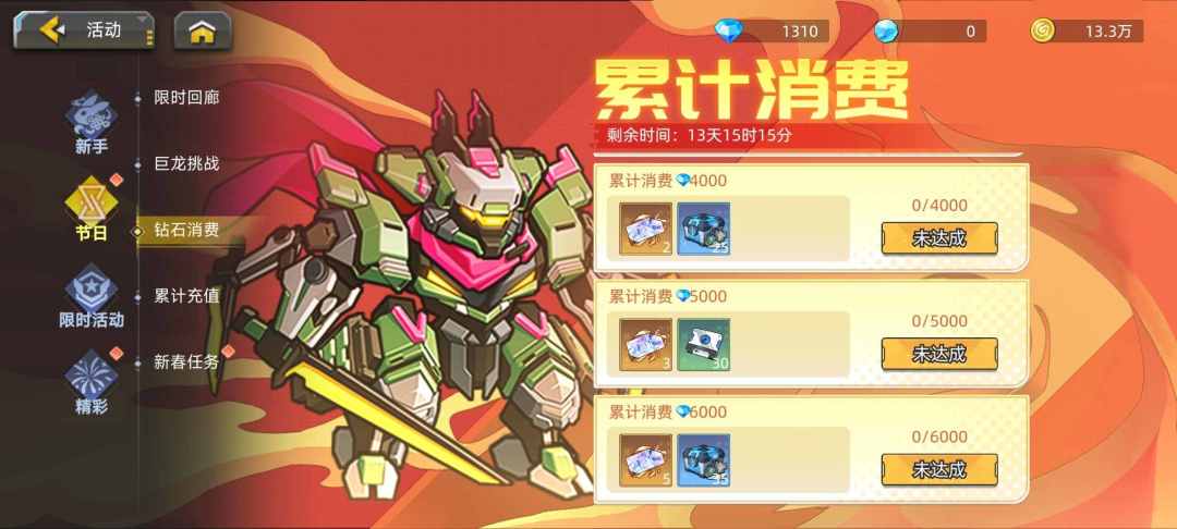 活动内容:活动期间,累计消费钻石达到目标值即可领取奖励!