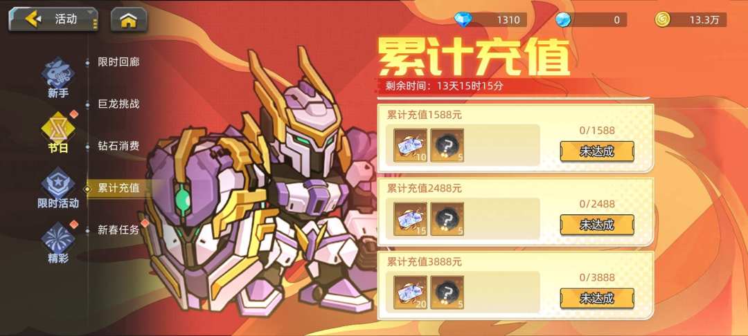 活动内容:活动期间,累计充值额度达到目标值即可领取奖励!