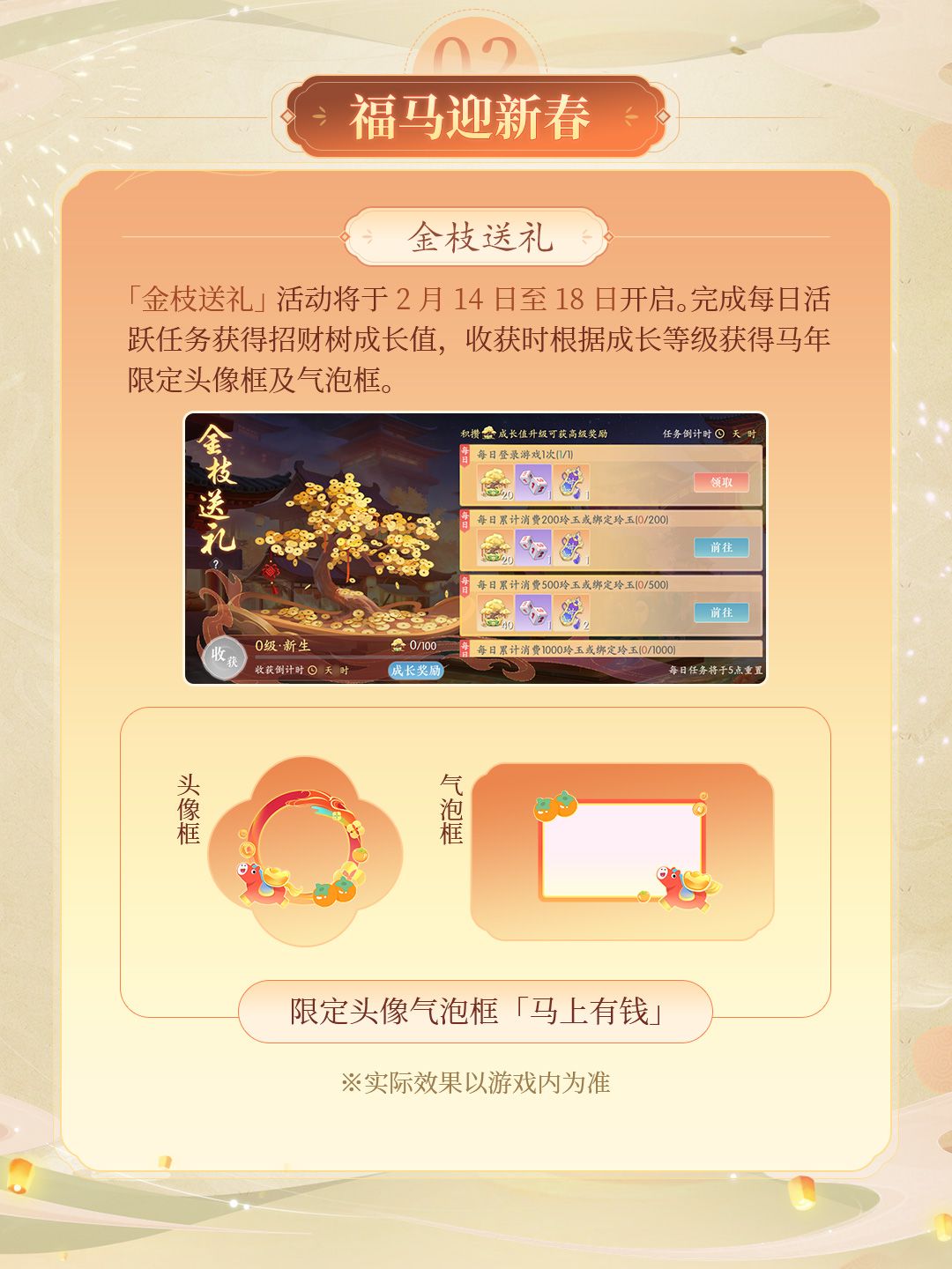 ♦金枝送礼:完成活跃任务获得招财树成长值,达到一定成长等级,可获得马年限定头像气泡框。