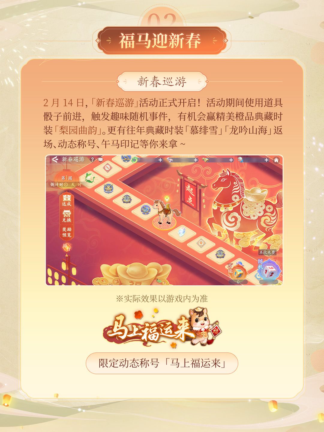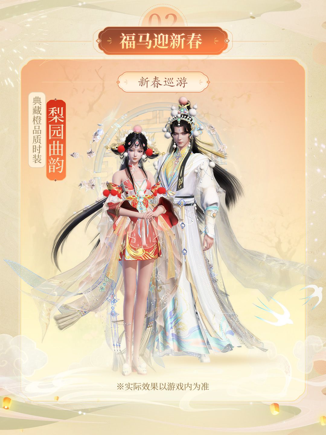 马踏春风来,佳偶成双归。《浮生忆玲珑》情人节新春限时活动将于明日(2月14日)正式启幕!参与活动有机会赢丰厚玲玉奖励,更有精美典藏橙品质时装「梨园曲韵」、限定手持背饰以及全新称号头像气泡框等你来拿。