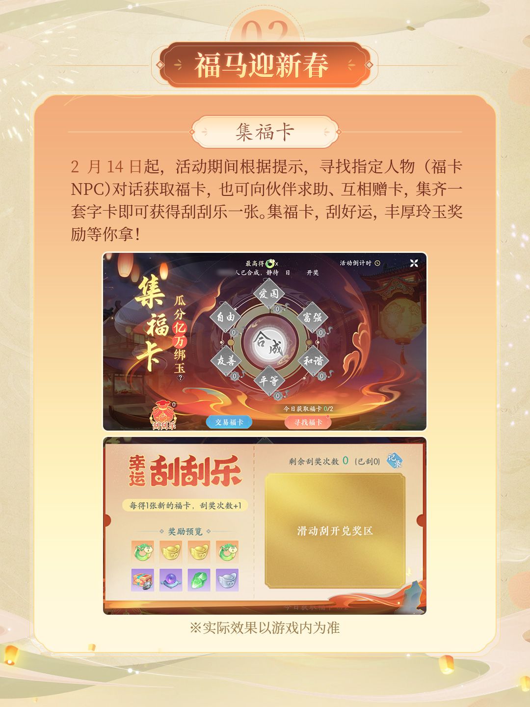 ♦集福卡:根据活动提示,寻找指定人物对话获取福卡,也可好友间相互赠送,集齐一套福卡后可得抽奖刮刮乐一张。
