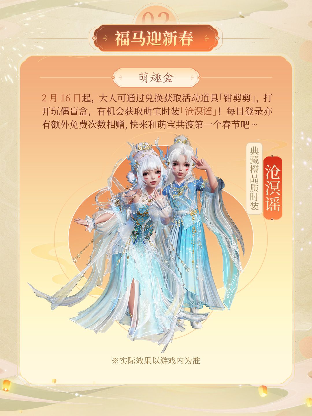 ♦萌趣盒:获取活动道具钳剪剪,打开玩偶盲盒,有机会获取萌宝时装「沧溟谣」。