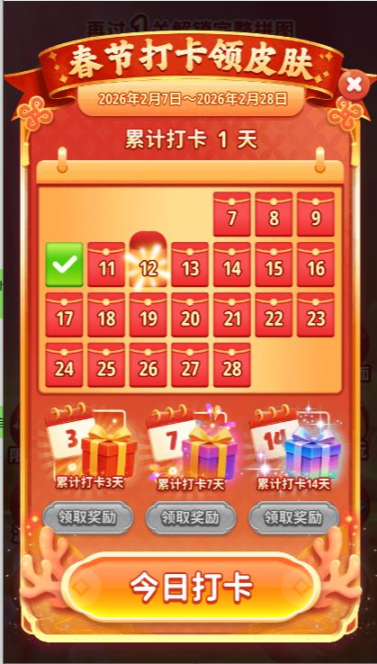 2月7日-2月28日期间,每日登录游戏打卡即可获得珍惜皮肤~