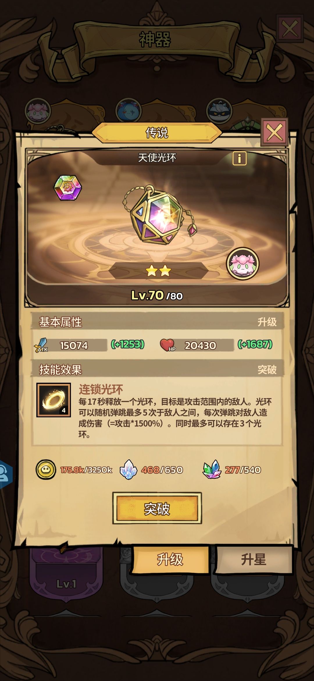 神器最厉害的是技能,以我带的神器为例,17秒发一个光环,可以弹射五次,最多存储3个光环,每次弹射攻击的15倍:我的攻击是1275k,15倍,弹射5次,等于攻击的75倍,我称之为最强技能!