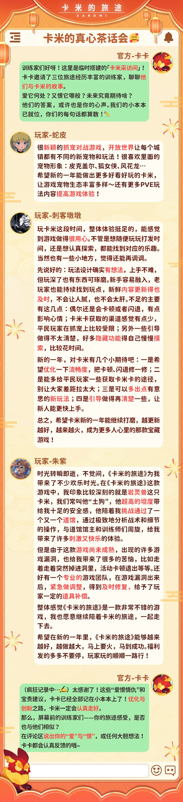 卡卡在此化身“新年信使”,一定会认真收集每一条留言,准确传达到团队耳边👂!