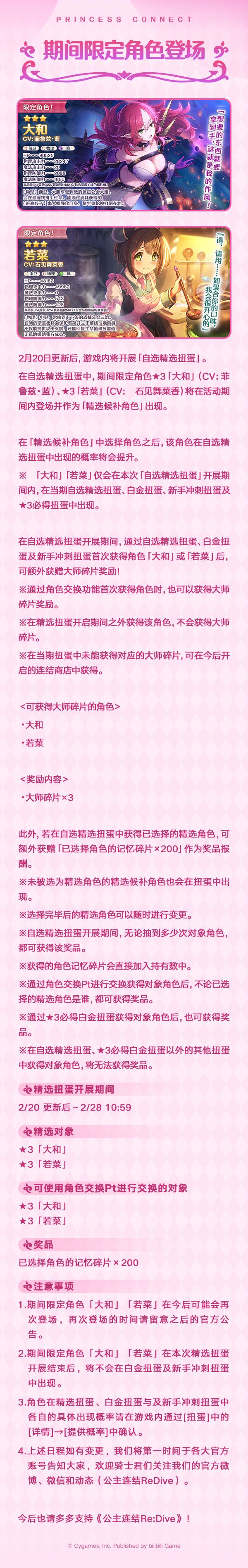 2月20日更新后,期间限定角色★3「大和」(CV:菲鲁兹·蓝)、★3「若菜」(CV:石见舞菜香)即将登场!游戏内将同时开启自选精选扭蛋,开展★3必得白金扭蛋;2月22日将更新每日优惠礼包!