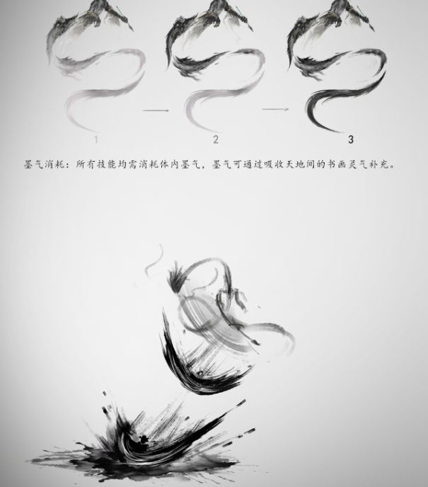 比如,毛笔裹挟着一团淡墨横扫而出,挥笔时形成弧形墨刃,墨团触敌瞬间如泼墨般炸开; 又比如,张口喷出一团浓墨色的龙息,化为如墨法入水般缓缓铺展的墨雾,在墨雾笼罩区域内,造成伤害,敌人视线受阻等等。