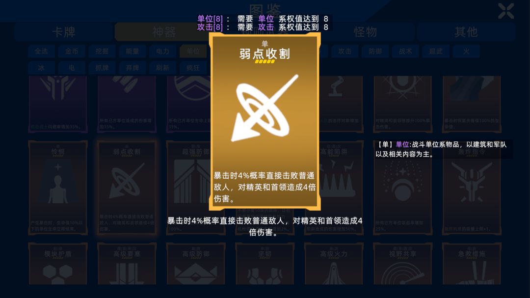 13.修复了【弱点收割】不生效的bug,并将其效果改为暴击时4%概率秒杀普通单位,对精英和boss造成4倍伤害。
