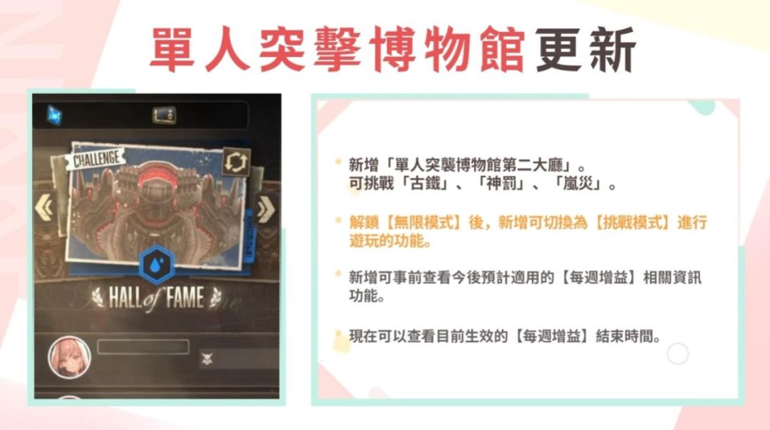 -大厅1 BOSS【母鲸】、【铁匠】、【过激派】的无限模式将新增任务,方舟排名的单人突击博物馆综合排名与大厅1排名也将进行扩充。