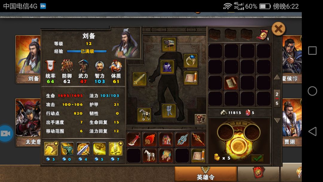 英雄的话选择刘备和贾诩。刘备点亮,外加一个电戒辅助一下输出。贾诩出装,双动鞋和蛮皮,武器选择火精剑更好。。我因为分解了暂时用扇子代替。。。