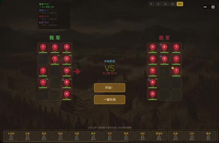 兵种克制:枪克骑兵、骑克盾,盾克枪。后排随意