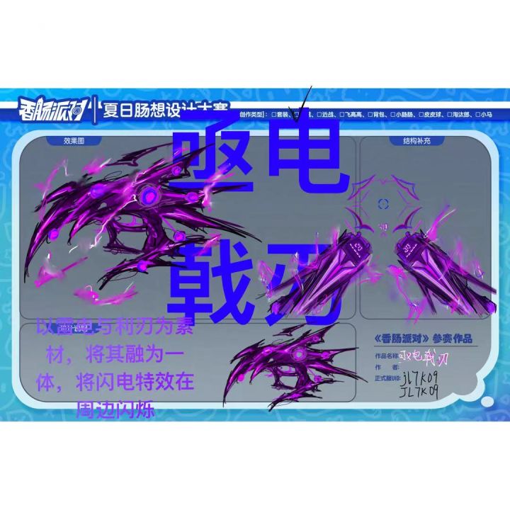 设计灵感:在炎炎夏日的午后,一场突如其来的雷暴席卷了香肠岛的沙滩。炽热的空气被撕裂,紫色的闪电如狂舞的双枪,将天空与海面切割成破碎的镜面,这把亟电戟刃,正是这场夏日雷暴的具象化产物