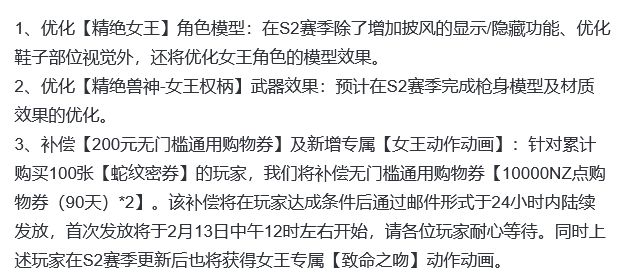 击问题闹得沸沸扬扬嘛,官方最近总算就女王活动这件事做出回应了!说是未来S2赛季会优化女王模型、加披风开关、修鞋模,还给抽满100张密券的玩家补两张10000NZ点购物券,再加个叫致命之吻的专属动作
