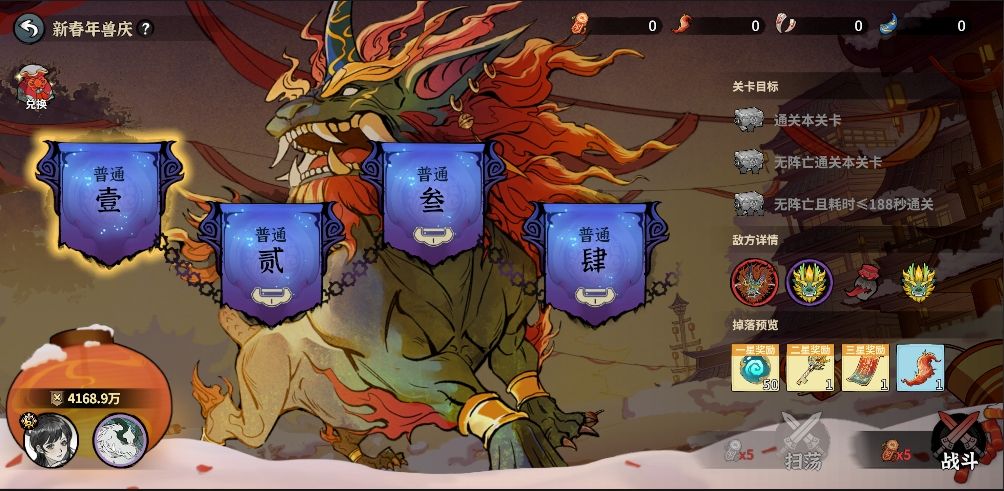 新春斗年兽:消耗“守岁令”挑战年兽关卡,掉落年兽之牙、年兽之爪、年兽之角材料,可在兑换商店进行兑换!