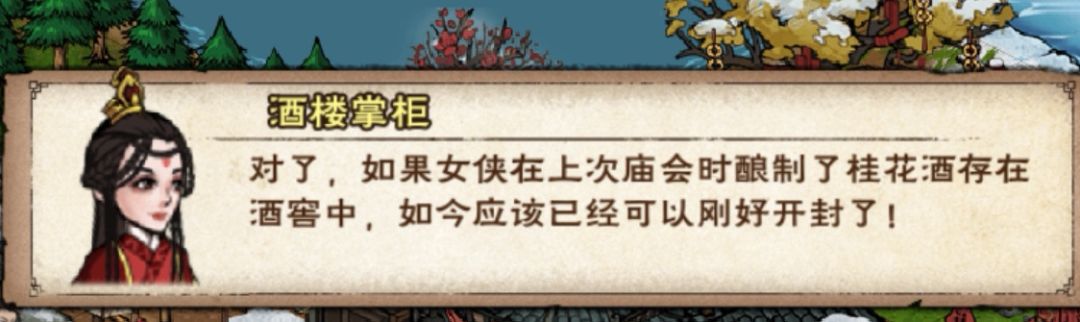 (5)烟雨酒楼,领取上一年活动酿的桂花酒等,并且可以酿酒留到明年喝,提供一些韧性效果等