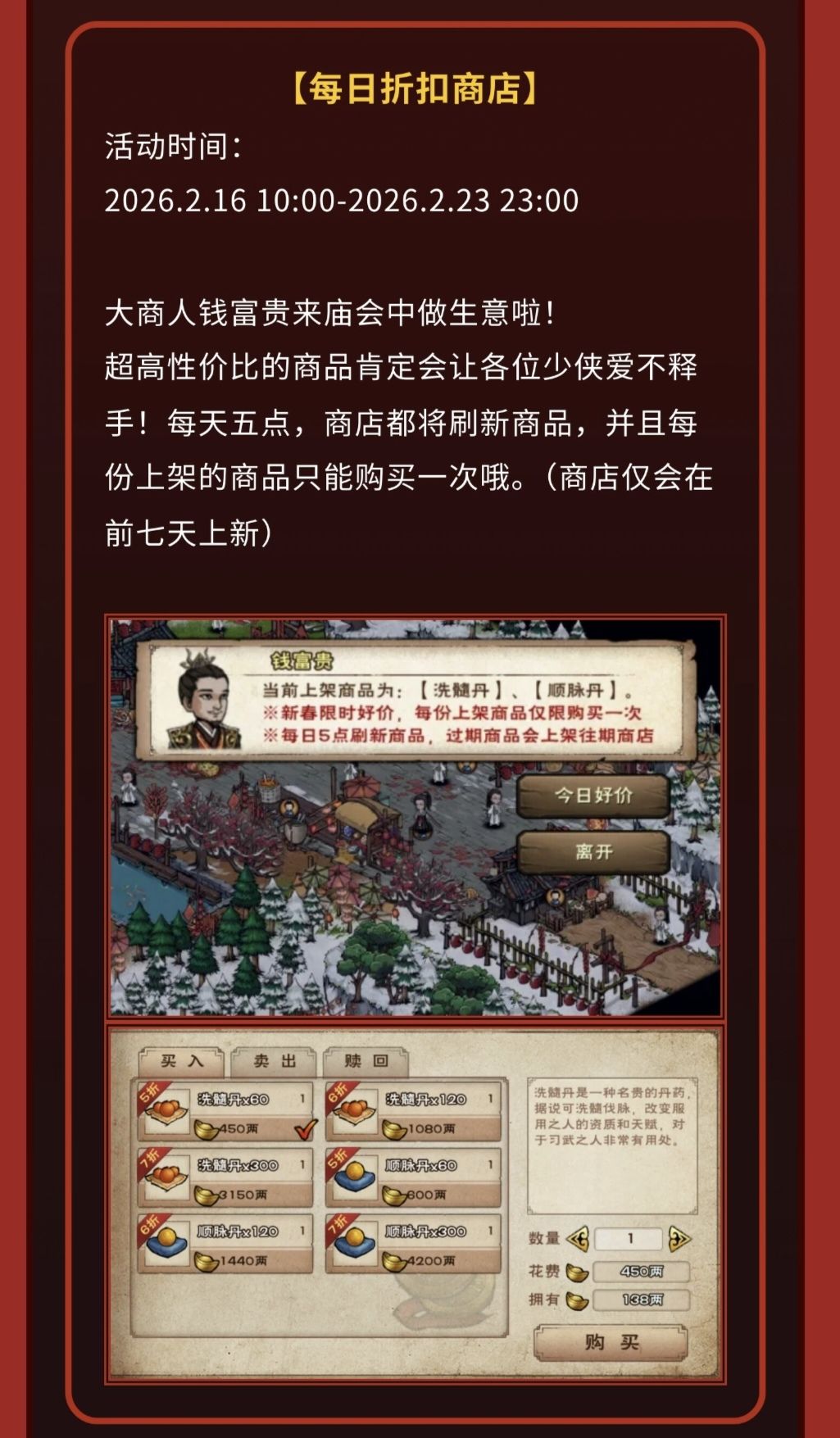 优惠商店一般分为五天(平民主要考虑前面三天)顺脉,洗髓臂力,根骨身法,内息阅历丹/真气丹紫金/乌缕平民一般买个五折,六折就行,七折太贵100颗资质丹可以拉满一个随从的单项资质,所以说7折...