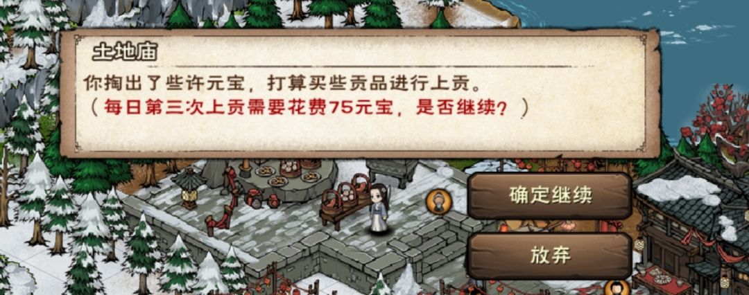 (6)土地庙,上贡。第一次免费,元宝可以上贡4次。每次25,50,75,100元宝,每次可获得50烟雨钱。氪佬可以拉满,平民非常建议拉两~三次,庙会部分道具比元宝值钱
