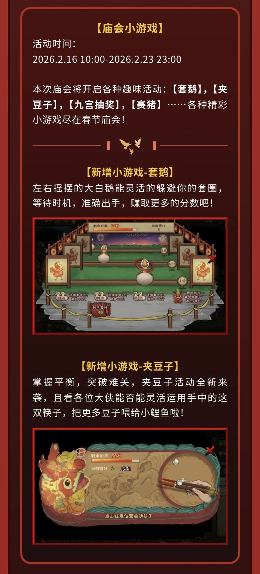 今年新加了两个小游戏,如果策划良心发现,加上坑人的赛猪一共有六个小游戏,小游戏除了赛🐷,其他都可以通过sl大法来获取全部奖励,一天三个活动一共是125*3=375,如果是五个活动则是125*5=625,赛🐷投入30,三分之一概率,胜利获取130烟雨钱,失败减少30烟雨钱。(看自身情况投入,帖主去年全输
